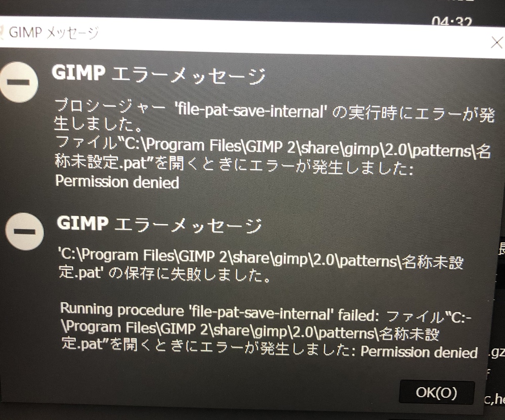 GIMPでパターンを追加しようとすると以下のエラーメッセージが出ますGI - gimp エラー 背景